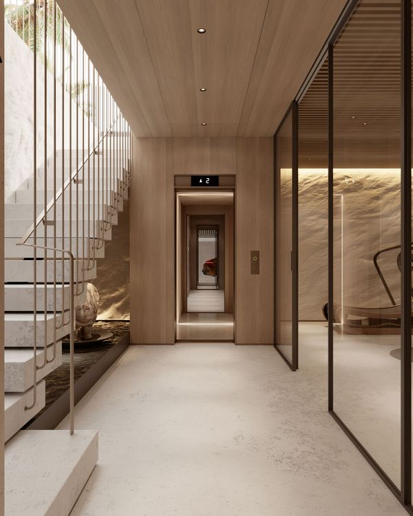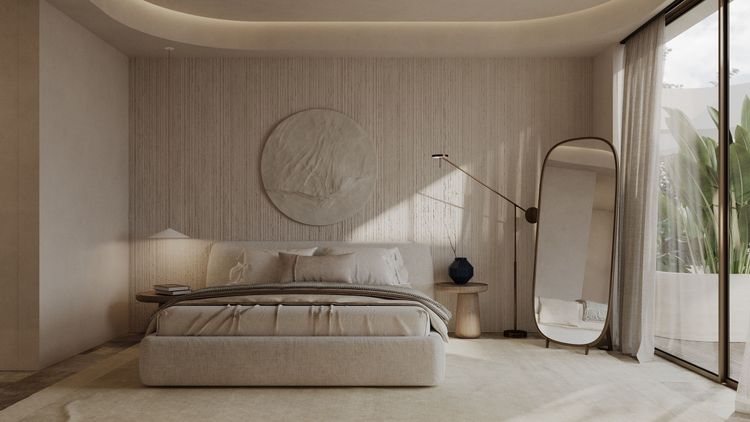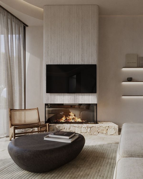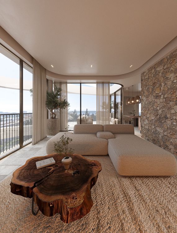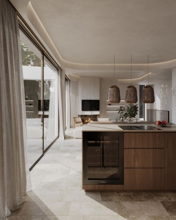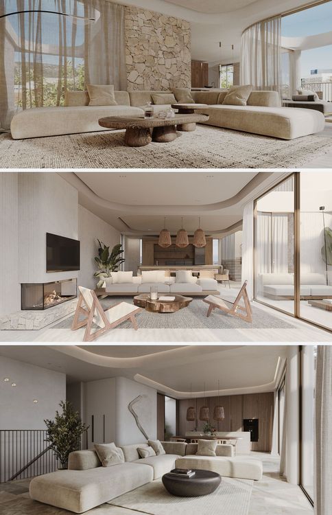 The interior design elegantly combines contemporary sophistication with Mediterranean warmth, using natural materials such as stone and wood alongside a neutral color palette for timeless elegance. It features spacious layouts with abundant natural light, seamlessly integrating indoor and outdoor spaces to evoke tranquility and luxury.